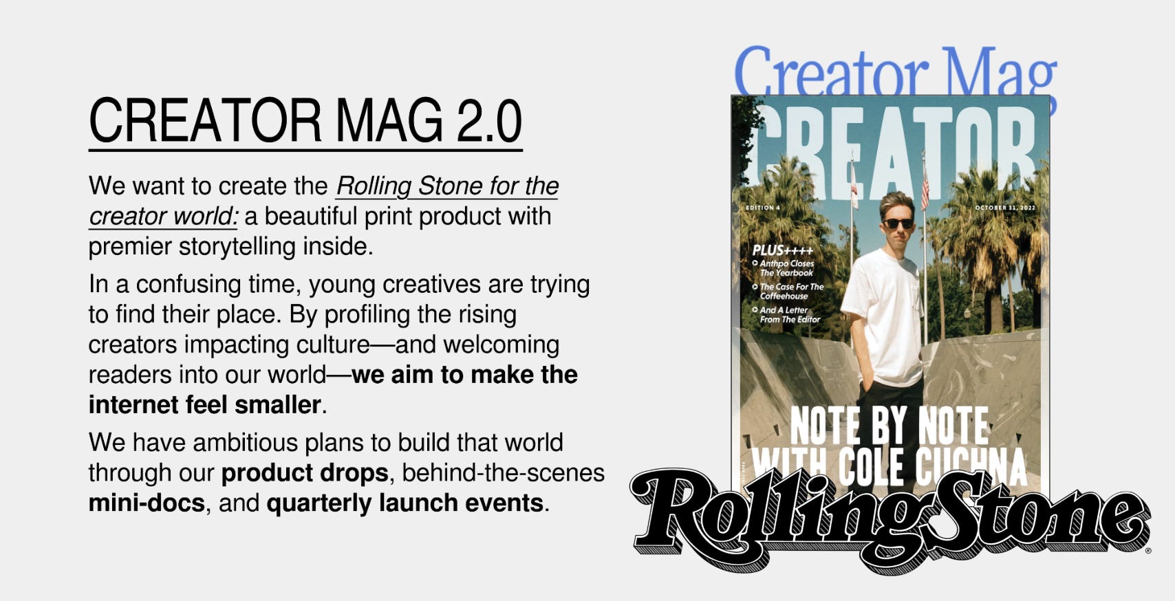 That’s why I’m excited to announce that Creator Mag is relaunching in 2025. We want to build the Rolling Stone for the creator world—a beautiful print product with premier storytelling inside, documenting a wild new frontier of tastemakers with on-the-ground reporting.