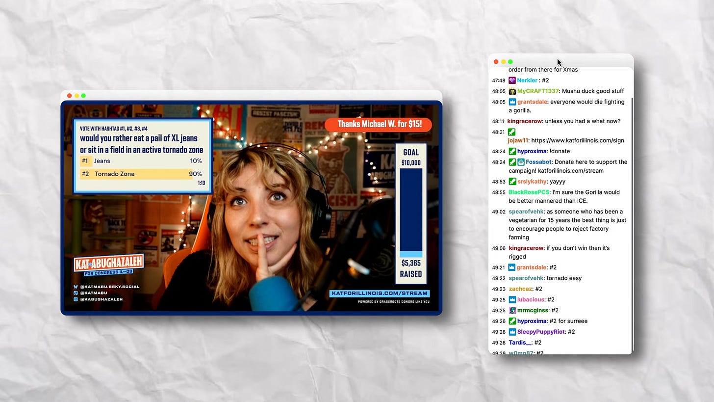 For several hours a week, Kat goes live, setting a four- or five-figure donation goal and streaming until she hits it. While video games and knitting take the foreground, campaign updates naturally bubble up; she's invited on guest creators like Brennan Lee Mulligan and Anthony Fantano to talk politics, too. Kat says chat members haven't just turned into small donorsâsome even volunteer for the campaign now.