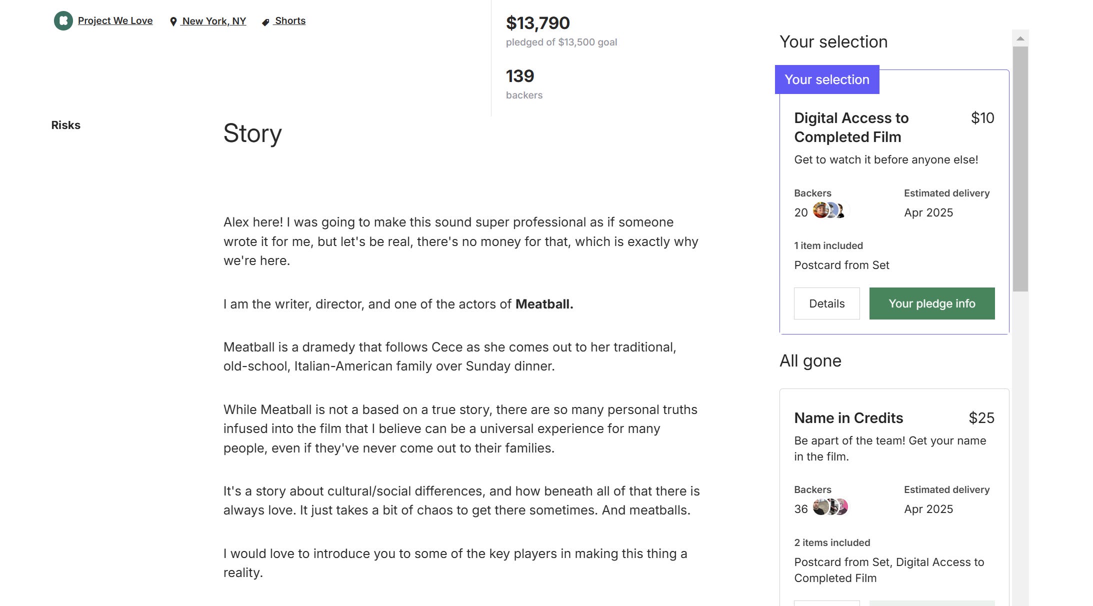 Alex Robinson is a filmmaker and creator based in New York City. She’s lived many lives on the Internet—including co-creating an NYC-centric sketch comedy series called Bare Minimum. Last month, Alex successfully completed a Kickstarter campaign to fund her first short film, Meatball.
