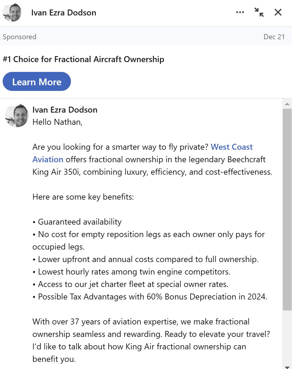 I think I'm interested in fractional aircraft ownership. Speaking of feedback loops, I get a lot of random DMs on LinkedIn these days—and they’re getting increasingly random-er.