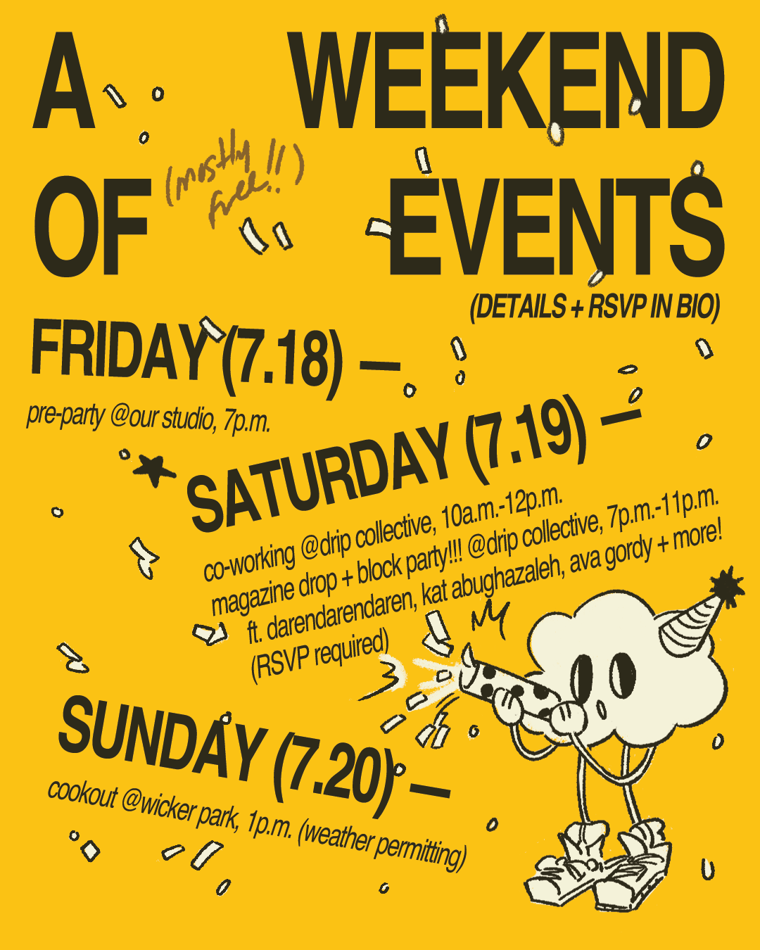 Lucky for you, we have a whole weekend of gatherings planned, from a pre-party at our studio Friday night to a cookout Sunday afternoon.