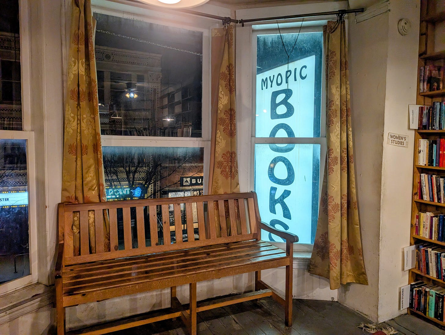 I hadn’t been into Myopic Books in roughly six years, but now that I live down the street, it was about time I popped my head back in. The store is crammed with new and secondhand titles alike; what I distinctly remembered about it—the third-floor bench and reading area—is still intact, with a great view out to the bustling Milwaukee Avenue on a Saturday night.