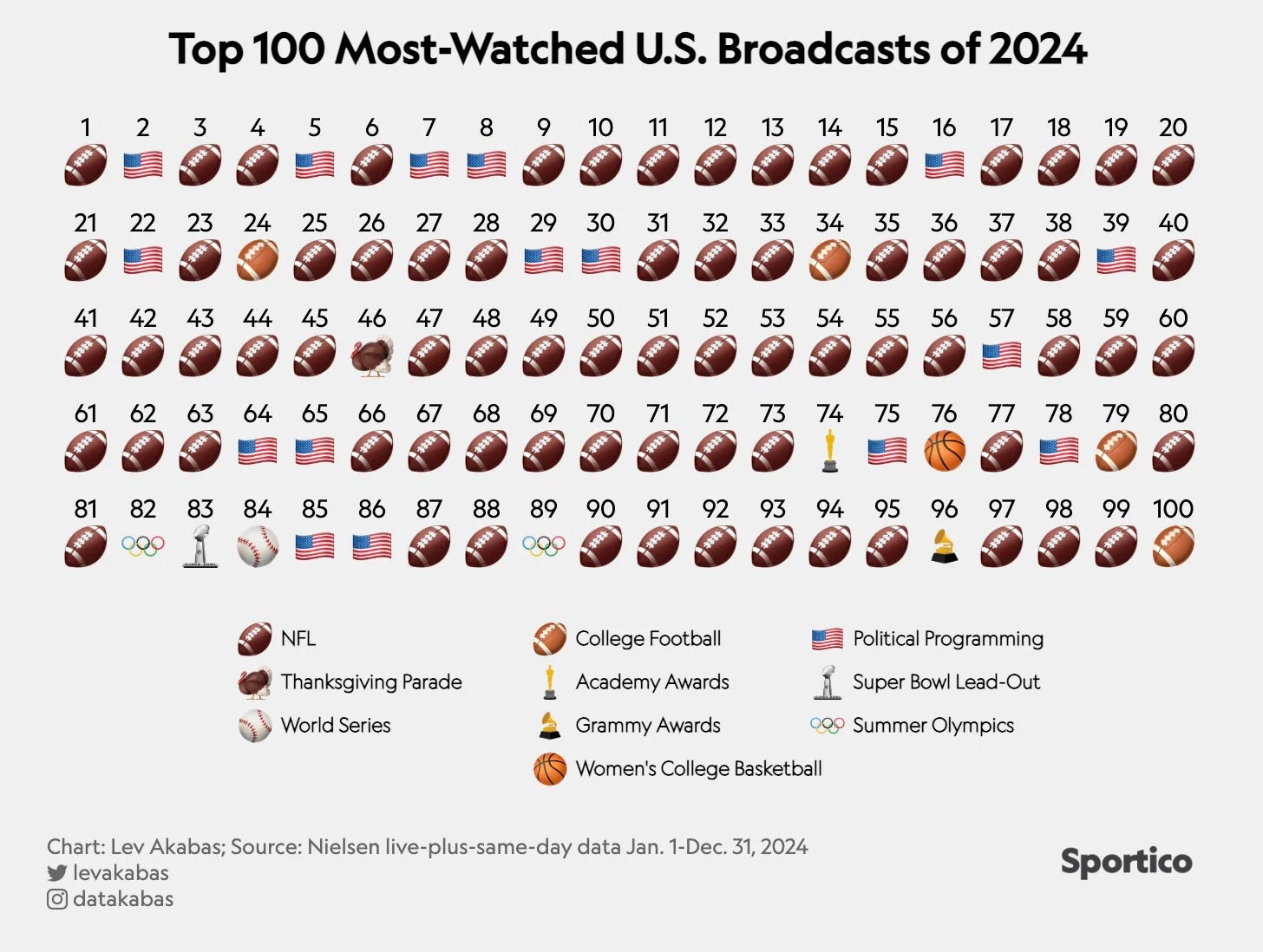 * This is technically a decrease from 2023, which saw the NFL take ninety-three slots. But again, given an extremely contentious election also happened last year, the NFL’s dominance is really just unparalleled. In comparison, the NBA didn’t have a single broadcast rank.