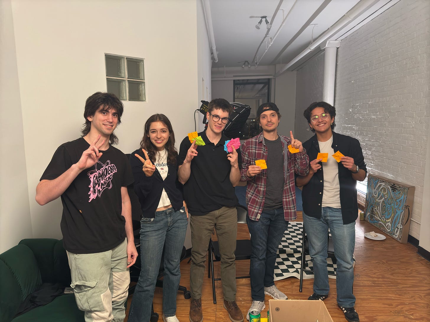 We kicked things off with our housewarming yesterday. The deep dish from Lou’s went quick; the interior design recs were well-received. Shout-out to everyone who pulled through, and congrats again to Team Two for winning our inaugural game of Fishbowl—your achievement has already been memorialized via a sticky note scoreboard placed on the wall.