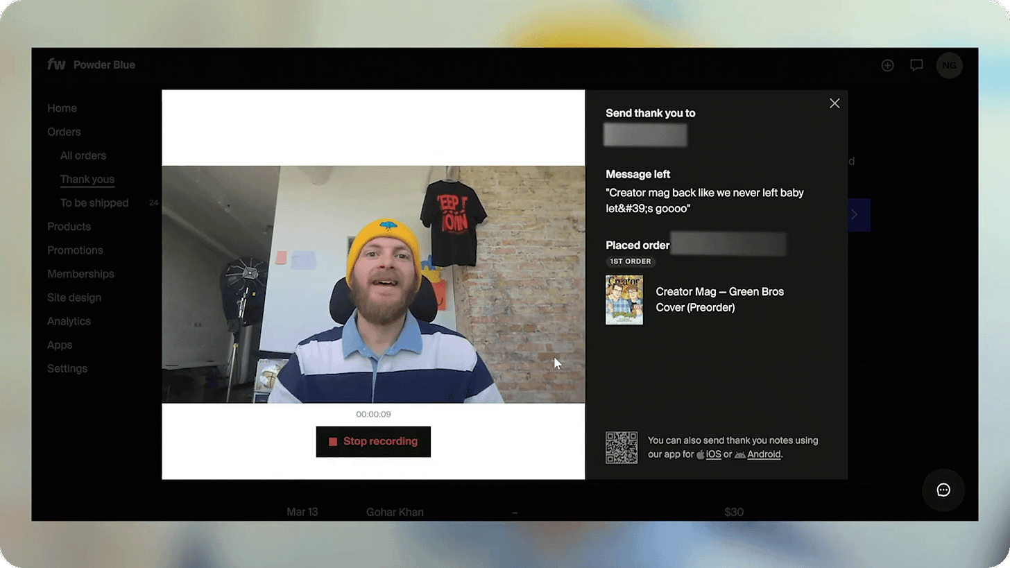 Fourthwall actually has a tool that lets us record and send short videos to each customer, providing their name, what they ordered, and any messages they left.