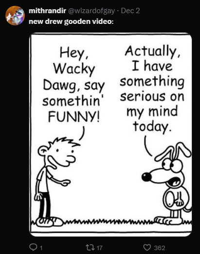 You slowly began to see it: first with commentary on the alternative, “weird ads” taking over feeds, before moving into the entertainment industry’s existential crisis during the 2023 strikes and how gambling influencers exploit vulnerable men. This clear deviation from his amateurish origins has not gone unnoticed; comedy creator Man Carrying Thing recently released a parody, “basically the 2 types of drew gooden videos,” where he oscillates between SpongeBob memes and commentary on “class struggles.”