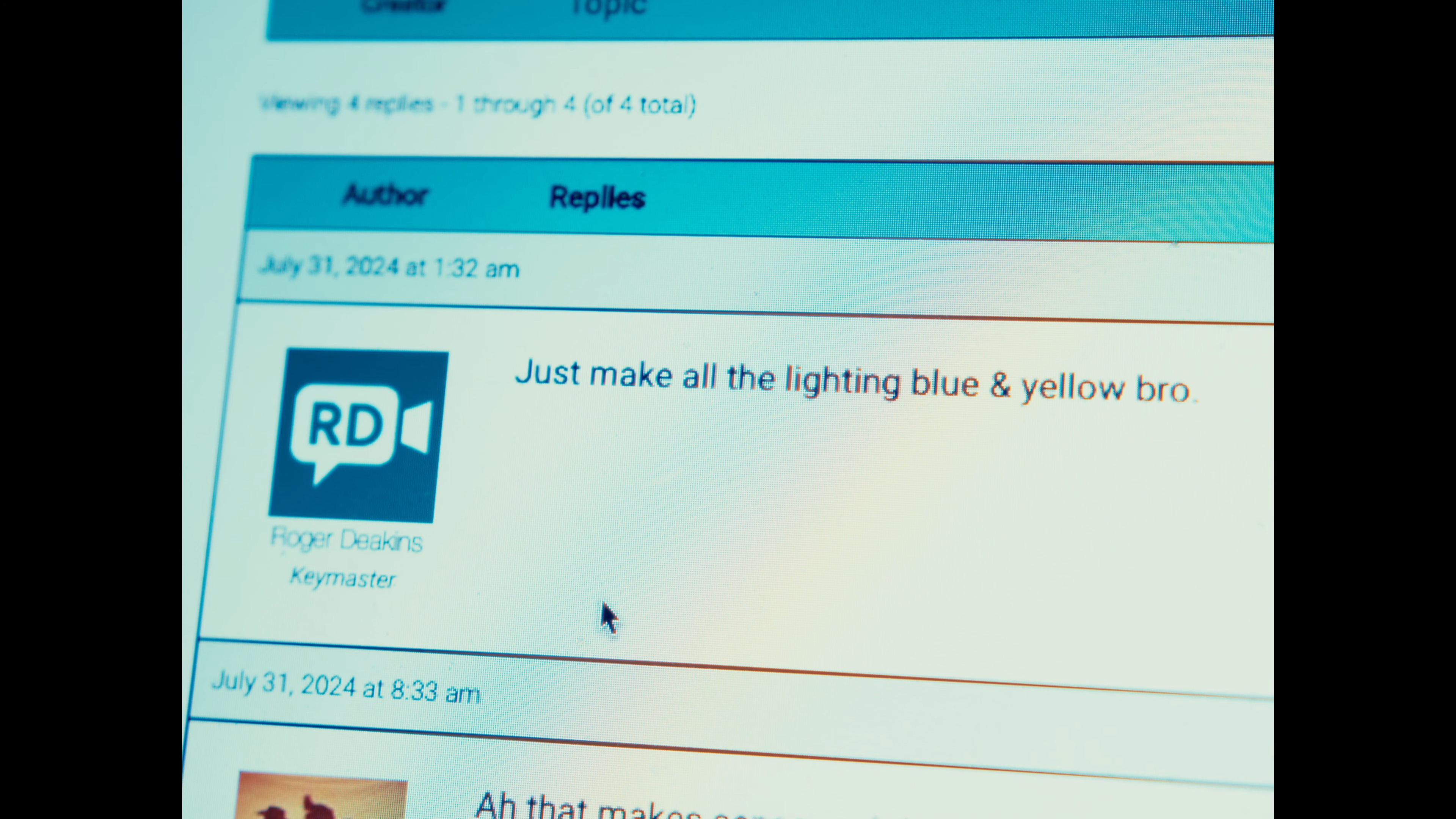 Directly prior to the throwaway line, we see the protagonist search “how to make good videos” online. A (satirically doctored) comment in a thread by Oscar-winning cinematographer Roger Deakins, “Just make all the lighting blue & yellow bro,” is the first to pop up.