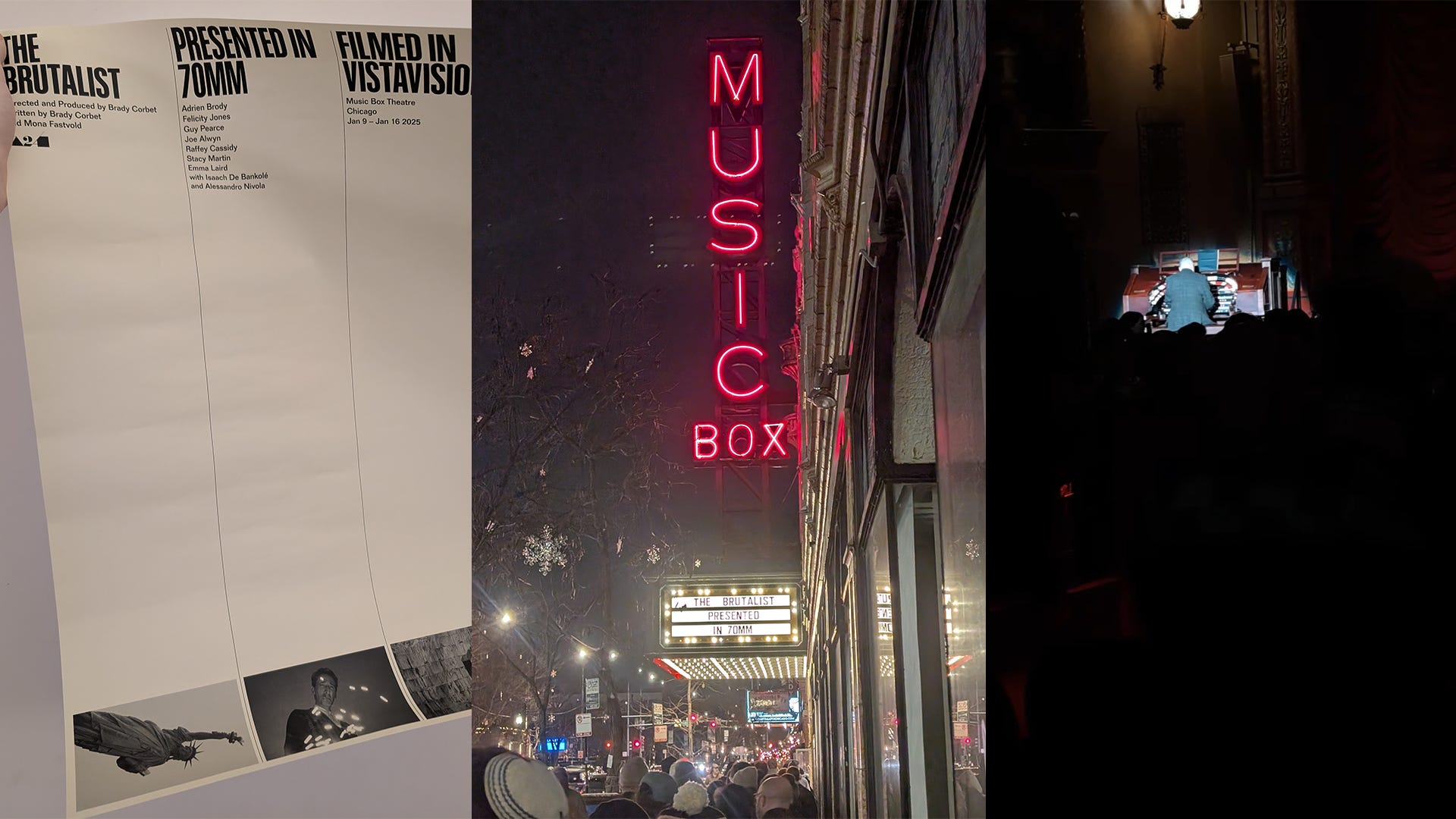 I think more people should make three-and-a-half-hour-long movies. Last night, I saw The Brutalist (2024) with some friends at the historic Music Box Theatre, located in the Lake View neighborhood of Chicago.